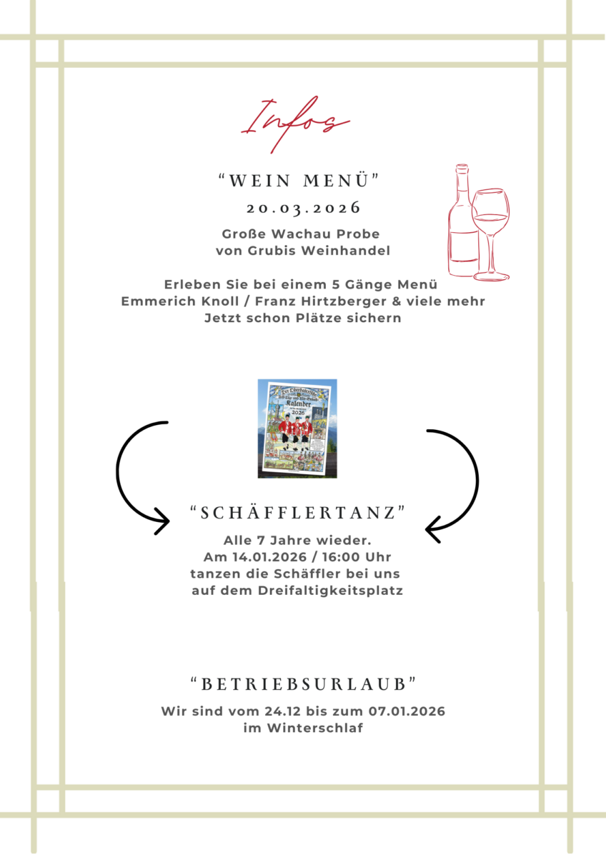 Das Jahr bietet zahlreiche Momente zum Feiern und Genießen. Wir laden Sie herzlich dazu ein, uns durch unseren kulinarischen Kalender zu begleiten. Gerne halten wir Sie hier über unsere kulinarischen Highlights auf dem Laufenden.